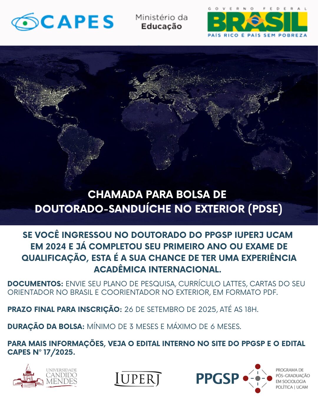Estão abertas as inscrições de propostas de estudantes do PPGSP- IUPERJ – UCAM para concorrer ao Programa de Doutorado Sanduíche.